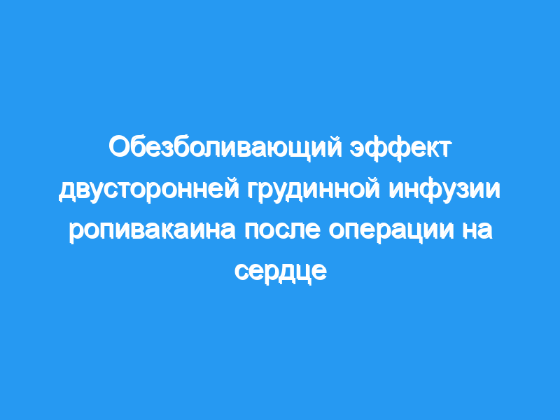 Предпосылки и задачи: Целью данного исследования была оценка последствий непрерывного послеоперационного введения местного анестетика через 2 катетера, размещенных глубоко под фасцией на боковых краях грудины, недалеко от места выхода межреберных нервов. Мы сосредоточились на боли во время мобилизации, поскольку этот аспект, вероятно, будет взаимодействовать с послеоперационной заболеваемостью. Сорок взрослых пациентов, которым была запланирована операция на открытом сердце со стернотомией, были включены в это рандомизированное, плацебо-контролируемое двойное слепое исследование. В течение первых 48 послеоперационных часов вводили непрерывную инфузию с фиксированной скоростью 4 мл/час 0,2% ропивакаина или физиологического раствора. Все пациенты получали ацетаминофен и самостоятельно вводили морфин. Результаты эффективности были следующими: оценка боли во время стандартизированной мобилизации и в покое, потребление морфина, спирометрия и газы артериальной крови, критерии послеоперационной реабилитации и удовлетворенность пациента. Общий уровень ропивакаина в плазме крови контролировался на протяжении всего исследования.