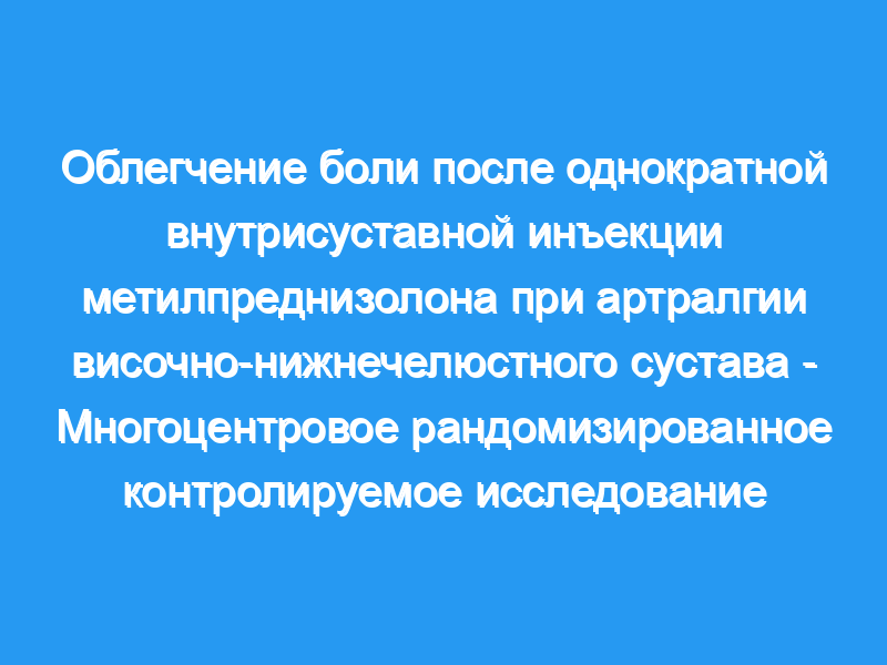 В общей сложности 54 пациента были рандомизированы на однократные внутривенные инъекции метилпреднизолона (n = 27) или физиологического раствора (n = 27). Между исходным уровнем и 4-недельным наблюдением интенсивность боли при максимальном открывании челюсти по ВАШ снизилась со среднего значения 61,0 (95% доверительный интервал [ДИ]: 50,1, 70,7) до 33,9 (95% ДИ: 21,6, 46,2) в группе метилпреднизолона и с 59,6 (95% ДИ: 50,7, 65,9) до 33,9 (95% ДИ: 23,8, 43,9) в группе физиологического раствора. Разница между группами не была существенной (Р = 0,812). Побочные эффекты, связанные с лечением, были удвоены в группе метилпреднизолона.