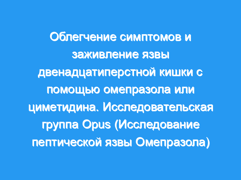 Через 2 недели показатели заживления на основе намерения к лечению составили: для омепразола 62% и для циметидина 33% (Р менее 0,001), а через 4 недели 85% и 61% соответственно (Р менее 0,001). Пропорции без симптомов через 2 недели составили 83% в группе омепразола и 63% в группе циметидина (Р менее 0,01), а через 4 недели — 84% и 72% (Р = 0,01). Пациенты, получавшие омепразол, принимали меньше таблеток антацидов, чем те, кто получал циметидин.
