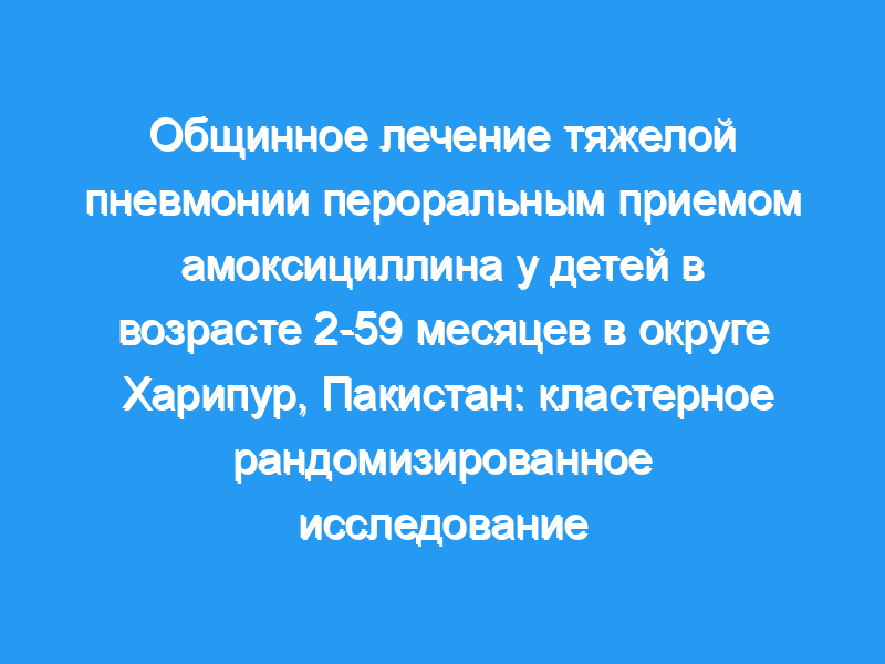 В округе Харипур, Пакистан, 28 кластеров были распределены случайным образом со стратификацией в соотношении 1:1 к кластерам вмешательства и контроля с использованием сгенерированной компьютером последовательности рандомизации. Дети были включены в исследование, если они были в возрасте 2-59 месяцев с тяжелой пневмонией, определенной ВОЗ, и проживали в районе исследования. В группах вмешательства общинные LHWs предоставляли матерям пероральный амоксициллин (80-90 мг/кг в день или 375 мг два раза в день для младенцев в возрасте 2-11 месяцев и 625 мг два раза в день для детей в возрасте 12-59 месяцев) с конкретными рекомендациями по его применению. В контрольных группах LHWs дали первую дозу перорального ко-тримоксазола (возраст 2-11 месяцев, сульфаметоксазол 200 мг плюс триметоприм 40 мг, возраст от 12 месяцев до 5 лет, сульфаметоксазол 300 мг плюс триметоприм 60 мг) и направили детей в медицинское учреждение для получения стандартной медицинской помощи. Участники, лица, осуществляющие уход, и эксперты не были замаскированы для назначения лечения. Первичным исходом был отказ от лечения на 6-й день. Анализ проводился в соответствии с протоколом с поправкой на кластеризацию внутри групп с использованием обобщенных оценочных уравнений. Это исследование зарегистрировано, номер RCTN10618300. Выводы: Мы распределили 1995 детей на лечение в 14 группах вмешательства и 1477 в 14 контрольных группах, и мы проанализировали 1857 и 1354 детей соответственно. Скорректированная по кластеру частота неудач лечения к 6-му дню была значительно снижена в группах вмешательства (165 [9%] против 241 [18%], разница в риске -8·9%, 95% ДИ от -12·4 до -5·4). Дальнейшая корректировка исходных ковариат не имела большого значения (-7·3%, от -10·1 до -4·5). Было зарегистрировано два случая смерти в контрольных группах и один в группе вмешательства. Большая часть снижения риска была связана с возникновением лихорадки и втягивания нижней части грудной клетки в течение дня 3 (-6·7%, -10·0 до -3·3). Нежелательными явлениями были диарея (n=4) и кожная сыпь (n=1) в группах вмешательства и диарея (n=3) в контрольных группах. Интерпретация: Ведение случаев заболевания в сообществе может привести к стандартизированному лечению детей с тяжелой пневмонией, сократить задержки в начале лечения и снизить затраты для семей и систем здравоохранения. Финансирование: Агентство США по международному развитию (USAID).