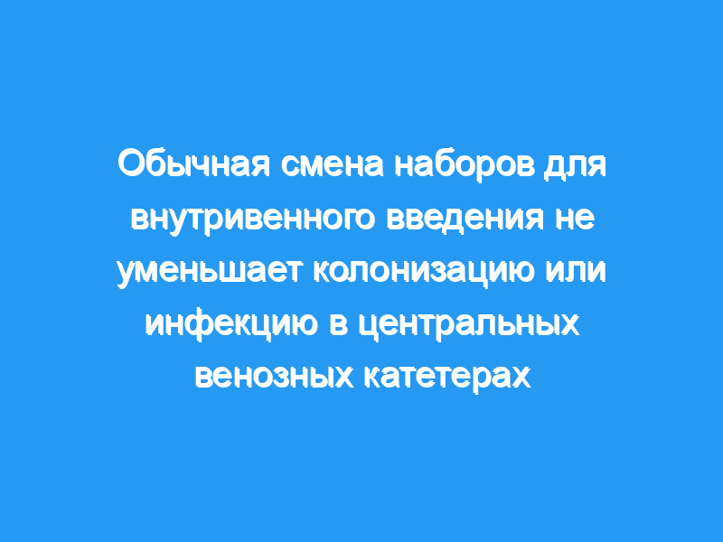 Отделение интенсивной терапии на восемнадцать коек (отделение интенсивной терапии) в крупной столичной больнице. Участники: Двести пятьдесят один пациент с 404 хлоргексидиновыми глюконатами и покрытыми сульфадиазином серебра мультипросветными CVC. Вмешательства: CVCS, введенные в отделение интенсивной терапии и in situ на 4-й день, были рандомизированы, чтобы изменить их наборы для внутривенного введения на 4-й день (n = 203) или вообще не вводить (n = 201). Использование контейнеров с жидкостью и наборов для введения препаратов крови было ограничено 24 часами. CVCS удаляли, когда в этом не было необходимости, при подозрении на инфекцию или на месте на 7-й день. Посевы из катетера проводили после удаления слепым лабораторным персоналом. Бактериемия, связанная с катетером, была диагностирована слепым реаниматологом с использованием строгих определений. Были собраны данные относительно продолжительности катетера, места установки, оценки острой физиологии и хронического состояния здоровья (APACHE) II, возраста пациента, диагноза, гипергликемии, гипоальбуминемии, иммунного статуса, количества контейнеров с жидкостью и внутривенных инъекций, а также введения пропофола, крови, общего парентерального питания или инфузии липидов.