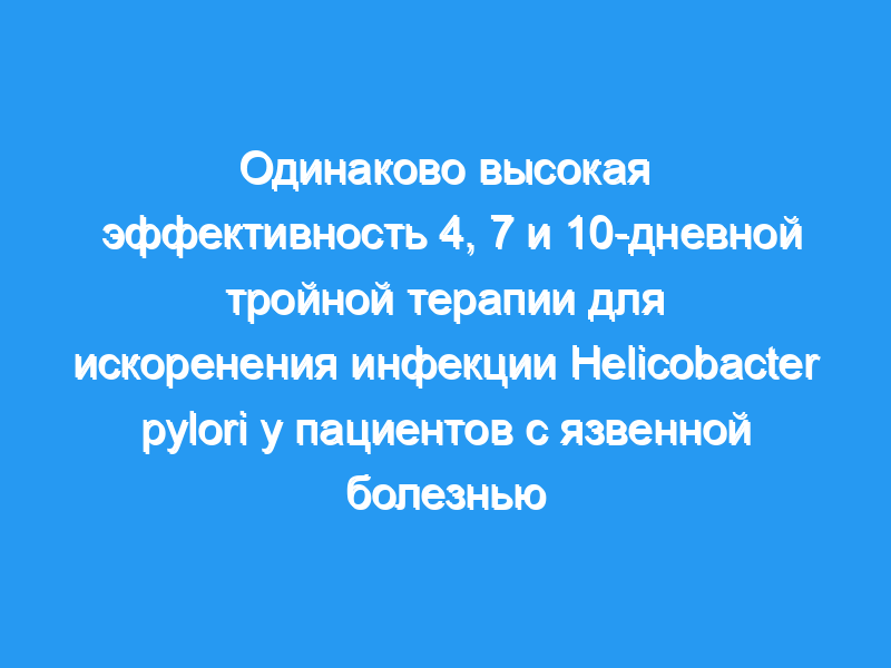 Пациенты с язвой (n=76) были рандомизированы для трех двойных слепых 10-дневных курсов лечения: ОМС 4 состоял из 4 дней в день 20 мг омепразола, 400 мг метронидазола и 250 мг кларитромицина, затем 6 дней в день 20 мг омепразола и антибиотики плацебо (n=27), OMC 7 состоял из 7 дней приема омепразола 20 мг, метронидазола 400 мг и кларитромицина 250 мг и 3 дней приема омепразола 20 мг и антибиотиков плацебо (n=25), OMC 10 состоял из 10 дней приема омепразола 20 мг мг, метронидазол 400 мг и кларитромицин 250 мг (n=24). H. pylori оценивали с помощью биопсий для посева и гистологии до и через 4-6 недель после терапии ОМК. Резистентность к метронидазолу и резистентность к кларитромицину оценивали с помощью E-теста.