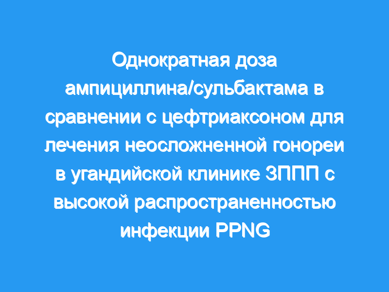 Таким образом, в группе пациентов клиники в Кампале, Уганда, преимущественно мужского пола, ампициллин/сульбактам был таким же безопасным и эффективным, как и цефтриаксон, при лечении неосложненного гонококкового инфекции нижних отделов половых путей, вызванные либо штаммами PPNG, либо штаммами, не относящимися к PPNG.