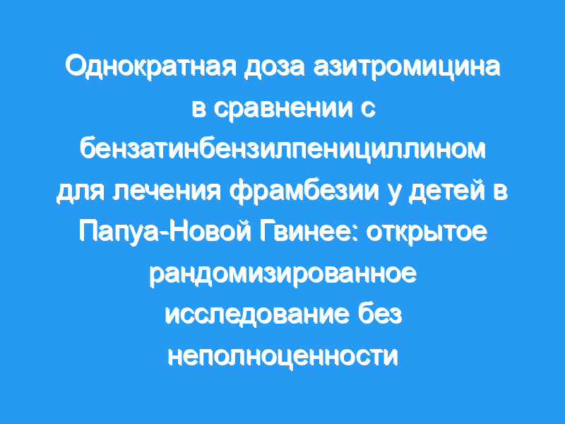 Мы провели открытое рандомизированное исследование без неполноценности в Медицинском центре Лихир, Папуа — Новая Гвинея, в период с 1 сентября 2010 года по 1 февраля 2011 года. Дети в возрасте от 6 месяцев до 15 лет с серологически подтвержденным диагнозом фрамбезии были случайным образом распределены с помощью сгенерированной компьютером последовательности рандомизации для получения либо одной пероральной дозы азитромицина в дозе 30 мг/кг, либо внутримышечной инъекции 50 000 ед/кг бензатина бензилпенициллина. Следователи были замаскированы для группового задания. Первичной конечной точкой была эффективность лечения, при этом скорость излечения определялась серологически как снижение титра быстрого реагина в плазме крови по крайней мере в двух разведениях к 6 месяцам после лечения, а у участников с первичными язвами — также путем эпителизации поражений в течение 2 недель. Неполноценность была показана, если верхний предел двустороннего 95% ДИ для разницы в показателях был ниже 10%. Первичный анализ проводился в соответствии с протоколом. Это испытание зарегистрировано в ClinicalTrials.gov , номер NCT01382004. Выводы: Мы распределили 124 пациента в группу азитромицина и 126 — в группу бензатинбензилпенициллина. В анализе по протоколу после 6 месяцев наблюдения 106 (96%) из 110 пациентов в группе азитромицина были излечены, по сравнению со 105 (93%) из 113 в группе бензатина бензилпенициллина (разница в лечении -3·4%, 95% ДИ -9·3 к 2·4), таким образом, удовлетворяя заранее определенным критериям неполноценности. Количество побочных эффектов, связанных с приемом лекарств (все легкие или умеренные), было одинаковым в обеих группах лечения (десять [8%] в группе азитромицина против восьми [7%] в группе бензатинбензилпенициллина). Интерпретация: Однократная пероральная доза азитромицина не уступает бензатинбензилпенициллину и позволяет избежать необходимости в оборудовании для инъекций и медицинском обученном персонале. Переход на более простую схему лечения азитромицином может позволить устранить фрамбезию с помощью программ массового приема лекарств. Финансирование: International SOS и Newcrest Mining.