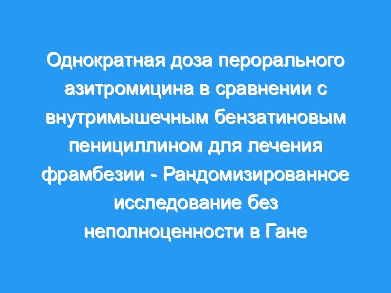 Фрамбезия — это трепонемная инфекция, которая была почти искоренена пятьдесят лет назад, однако эта болезнь вновь появилась в ряде стран, включая Гану. Однократное внутримышечное введение бензатинового пенициллина было основой лечения фрамбезии. Однако внутримышечные инъекции болезненны и создают проблемы с безопасностью и логистикой в бедных районах, где возникает фрамбезия. Одноцентровое рандомизированное контрольное исследование (РКИ), проведенное в Папуа — Новой Гвинее в 2012 году, продемонстрировало эффективность однократной дозы перорального азитромицина для лечения фрамбезии. В этом исследовании мы также сравнили эффективность однократной пероральной дозы азитромицина в качестве альтернативы внутримышечному введению бензатинового пенициллина для лечения заболевания в других географических условиях. Методология: Мы провели открытое рандомизированное исследование неполноценности в трех соседних районах Южной Ганы, эндемичных по фрамбезии. Детям в возрасте 1-15 лет с поражениями, вызванными фрамбезией, назначали либо 30 мг/кг азитромицина перорально, либо 50 000 ед/кг бензатинового пенициллина внутримышечно. Первичной конечной точкой была клиническая скорость излечения, определяемая как полное или частичное разрешение поражений через 3 недели после лечения. Вторичной конечной точкой было серологическое излечение, определяемое как минимум 4-кратное снижение исходного титра RPR через 6 месяцев после лечения. Неполноценность лечения азитромицином определялась, если верхняя граница 2-стороннего 95% ДИ составляла менее 10%. Результаты: Средний возраст участников составил 9,5 лет (S.D.3.1, диапазон: 1-15 лет), 247 (70%) были мужчинами. Частота клинического излечения составила 98,2% (95% ДИ: 96,2-100) в группе азитромицина и 96,9% (95% ДИ: 94,1-99,6) в группе бензатинпенициллина. Показатели серологического излечения через 6 месяцев составили 57,4% (95% ДИ: 49,9-64,9) в группе азитромицина и 49,1% (95% ДИ: 41,2-56,9) в группе бензатинпенициллина, что соответствует указанным критериям неполноценности.