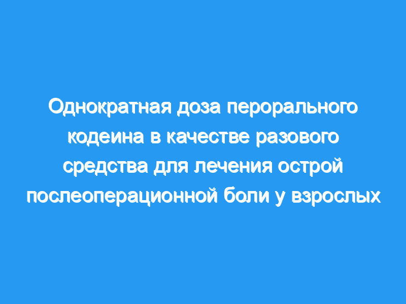 Было включено тридцать пять исследований (1223 участника получали кодеин в дозе 60 мг, 27 — кодеин в дозе 90 мг и 1252 — плацебо). Комбинируя все виды хирургических вмешательств (33 исследования, 2411 участников), кодеин в дозе 60 мг давал не менее 50% обезболивания в течение 4-6 часов из 12 (8,4 — 18) по сравнению с плацебо. По меньшей мере 50%-ное облегчение боли было достигнуто на 26% при приеме кодеина в дозе 60 мг и на 17% при приеме плацебо.После стоматологической операции NNT составил 21 (от 12 до 96) (15 исследований, 1146 участников), а после других видов операций NNT составил 6,8 (от 4,6 до 13) (18 исследований, 1265 участников). NNT для предотвращения использования спасательного лекарства в течение 4-6 часов составило 11 (от 6,3 до 50) (11 исследований, 765 участников, в основном не стоматологов), среднее время его применения составило 2,7 часа с кодеином и 2,0 часа с плацебо. Больше участников испытали побочных эффектов при приеме кодеина в дозе 60 мг, чем при приеме плацебо, разница не была существенной, и ни один из них не был серьезным. При приеме плацебо произошло два нежелательных явления отмены препарата. Выводы авторов: Однократная доза кодеина 60 мг обеспечивает хорошее обезболивание немногим людям и не выгодно отличается от обычно используемых альтернатив, таких как парацетамол, НПВП и их комбинации с кодеином, особенно после стоматологической операции, большая разница между стоматологической и другой хирургией была неожиданной. Более высокие дозы не оценивались.