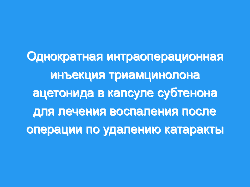 Однократная интраоперационная инъекция 40 мг триамцинолона ацетонида в капсуле под теноном. продемонстрировал клинически эквивалентный терапевтический ответ и переносимость глаз по сравнению с 1% каплями преднизолона в контроле послеоперационного воспаления после неосложненной операции по удалению катаракты и заслуживает дальнейшего изучения.