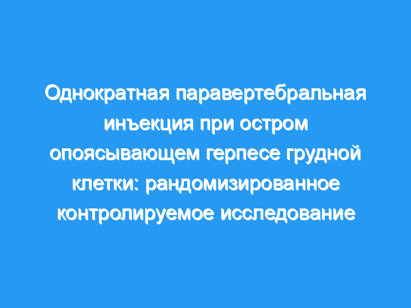 Сто тридцать восемь пациентов старше 50 лет с острой грудной герпетической сыпью были рандомизированы для получения паравертебральной блокады с использованием либо 10 мл физиологического раствора (группа плацебо), либо 25 мг бупивакаина плюс 8 мг дексаметазона в общем объеме 10 мл (активная группа).. Все пациенты получали прегабалин по 150 мг два раза в день. Ацетаминофен был доступен в качестве спасательной анальгезии. Тяжесть боли оценивали с помощью визуальной аналоговой шкалы (ВАШ). Потребление анальгетиков оценивалось еженедельно. Сообщалось о времени устранения боли, заживлении кожных высыпаний и частоте стойких постгерпетических болей.