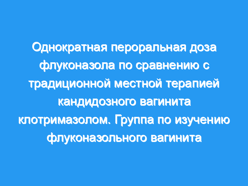 Кандидозный вагинит в настоящее время лечат с помощью широкого спектра интравагинальных препаратов, обычно назначаемых в течение нескольких дней. Флуконазол с его выраженной активностью в отношении видов Candida и благоприятной фармакокинетикой предложил безопасную, эффективную и удобную альтернативу местной терапии в режиме однократного приема. План исследования: Мы провели многоцентровое, рандомизированное, проспективное, однократное слепое исследование 429 пациенток с острым кандидозным вагинитом, сравнив эффективность и безопасность однократного перорального приема флуконазола в дозе 150 мг с 7-дневным вагинальным лечением клотримазолом в дозе 100 мг. Были проведены оценки после лечения и показатели микологической эрадикации.