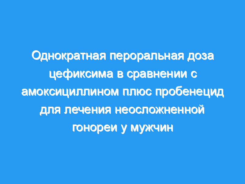 В этом рандомизированном исследовании однократная пероральная доза цефиксима в дозе 800 мг излечила 96 из 97 мужчин с неосложненным гонококковым уретритом, по сравнению с 44 из 46 мужчин, которые получали стандартную терапию амоксициллином (3 г) плюс пробенецид (1 г). Оба режима были неэффективны против сопутствующей инфекции Chlamydia trachomatis и Ureaplasma urealyticu.
