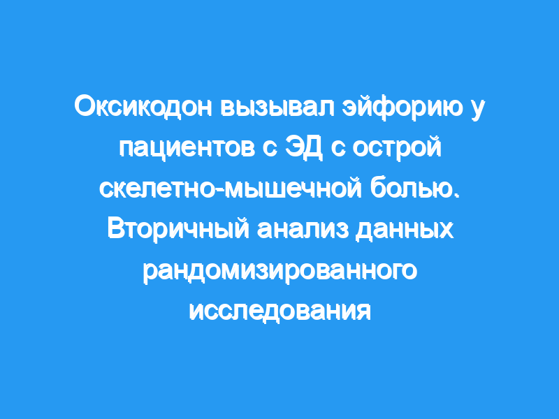 75 человек были рандомизированы на Oxy, 76 — на APAP. Средние баллы «насколько хорошо» составили 6,3 (SD 3,3) в группе Oxy и 4,8 (3,3) в группе APAP. Средние баллы «насколько высоки» составили 3,8 (3,7) в группе Oxy и 2,0 (3,0) в группе APAP. Средние баллы «насколько я счастлив» составили 4,9 (3,7) в группе Oxy и 3,1 (3,4) в группе APAP. После контроля за улучшением боли, возраста и пола разница между группами в «насколько хорошо» составила 1,0 (95% ДИ: -0,1, 2,0), «насколько хорошо» 1,5 (95% ДИ 0,4, 2,6) и «насколько хорошо» 1,5 (95% ДИ: 0,4, 2.7).