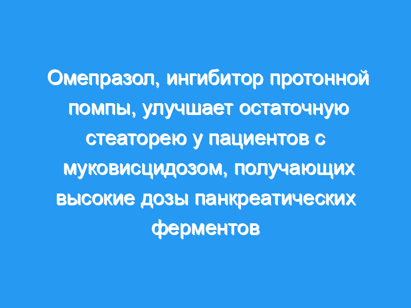 Несмотря на лечение препаратами ферментов поджелудочной железы в сверхфизиологических дозах, остаточная стеаторея является распространенной проблемой у пациентов с муковисцидозом (МВ) и недостаточностью поджелудочной железы. Стратегии повышения активности ферментов поджелудочной железы включают снижение кислотности двенадцатиперстной кишки. Целью данного исследования было оценить влияние омепразола (Лосек), ингибитора протонной помпы, на всасывание жира у пациентов с МВ с остаточной стеатореей, несмотря на высокие дозы добавок панкреатических ферментов (>, or =10000 Ед липазы/кг в день). Был выбран случайный дизайн перекрестного перехода. Переваривание жира оценивали с омепразолом и без него с помощью химических измерений жира в 3-дневных сборах кала вместе с 3-дневными взвешенными записями пищи для расчета поглощения жира. Были проанализированы результаты 15 пациентов (3 девочки и 12 мальчиков) с подтвержденной стеатореей во время контрольного обследования. Средний возраст составил 8,7 лет (диапазон 3,5-15,9 лет). Среднее суточное потребление липазы составляло 13 500 Ед/кг в день (диапазон 10 000-22 000 Ед/кг в день). Во время лечения омепразолом медиана потери жира с калом (г жира в день) снизилась с 13 г (квартили 11,5-16,5 г/день) до 5,5 г (квартили 4,9-8,1 г/день) (P<,0,01). Такое же улучшение было отмечено при расчете абсорбции жира: 87% (квартили 81-89%) без омепразола против 94% (квартили 90-96%) с омепразолом (P<,0,001).