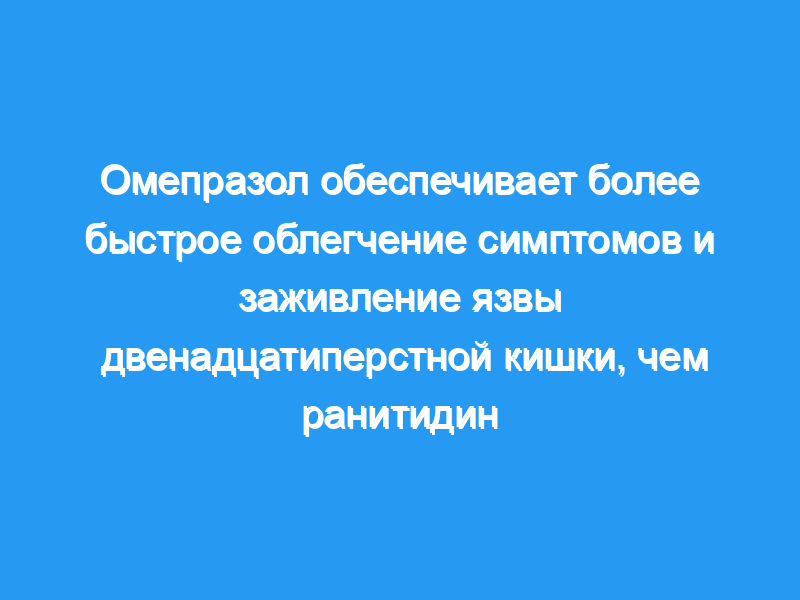 Омепразол в дозе 20 мг каждое утро обеспечивает более быстрое облегчение симптомов язвенной болезни двенадцатиперстной кишки и излечивает большую часть язв двенадцатиперстной кишки в течение 2 и 4 недель, чем ранитидин, 300 мг мг каждую ночь.