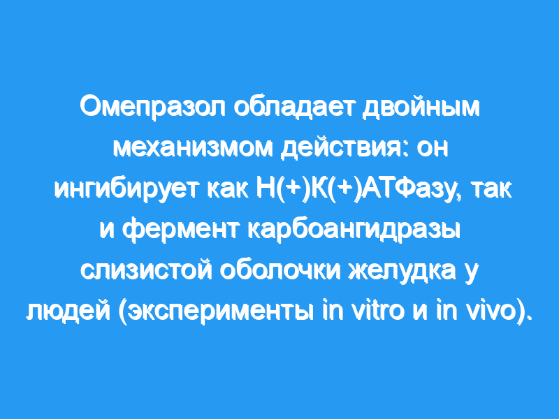 Наши результаты убедительно свидетельствуют о том, что омепразол обладает двойным механизмом действия: H(+)Ингибирование K(+)АТФазы и ингибирование CA слизистой оболочки желудка, и что эти ферменты могут быть функционально сопряжены.