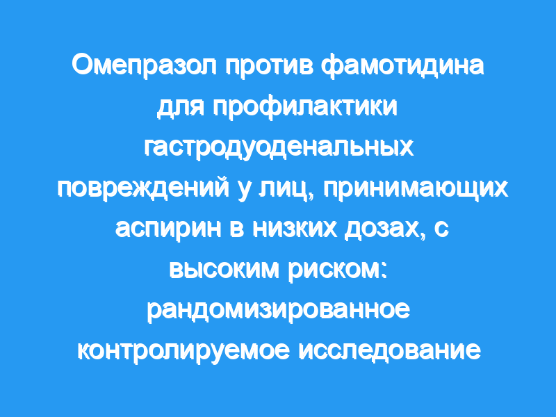 Пациенты, принимавшие низкие дозы аспирина с пептическими язвами в анамнезе, у которых при первичной эндоскопии не было разрывов слизистой оболочки гастродуоденальной области, были рандомизированы на прием фамотидина (20 мг в день) или омепразола (20 мг в день) в течение 6 месяцев. Последующая эндоскопия проводилась в конце шестого месяца и всякий раз, когда возникали дискомфорт в эпигастрии, кровотечение или мелена. Первичной конечной точкой было возникновение разрывов слизистой оболочки гастродуоденальной области. Вторичными конечными точками были (1) возникновение гастродуоденальных язв и (2) возникновение гастродуоденального кровотечения. Результат: В период с ноября 2013 года по июнь 2018 года 170 пациентов были рандомизированы для получения фамотидина (n = 84) или омепразола (n = 86). Частота разрывов слизистой оболочки желудка и двенадцатиперстной кишки составила 33,8% среди пациентов, получавших фамотидин, и 19,8% среди пациентов, получавших омепразол (95% ДИ: 0,4%-27,5%, р = 0,045). В двух группах пациентов были сопоставимые показатели заболеваемости гастродуоденальными язвами (20,0% против 9,8%, р = 0,071) и гастродуоденальными кровотечениями (2,5% против 0%, р = 0,243). Многофакторный анализ показал, что использование ингибитора протонной помпы было независимым защитным фактором (отношение шансов: 0,47, 95% ДИ: 0,23-0,99, р = 0,047), и что курение было фактором риска разрывов слизистой оболочки (отношение шансов: 3,84, 95% ДИ: 1,52-9,71, р = 0,004).