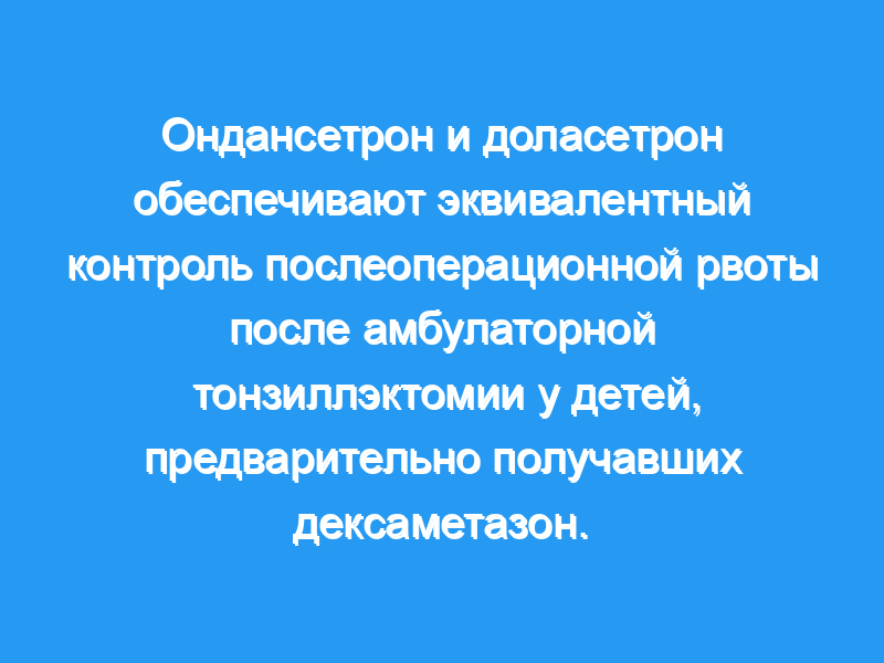 Частота полного ответа, определяемая как отсутствие рвоты/рвоты и отсутствие противорвотных средств в течение 48 ч, была значительно увеличена в группах 1 (76%) и 2 (74%) по сравнению с группой 3 (44%). Противорвотная эффективность профилактических ондансетрона и доласетрона была сопоставима у детей, предварительно получавших дексаметазон, перенесших амбулаторную тонзиллэктомию.