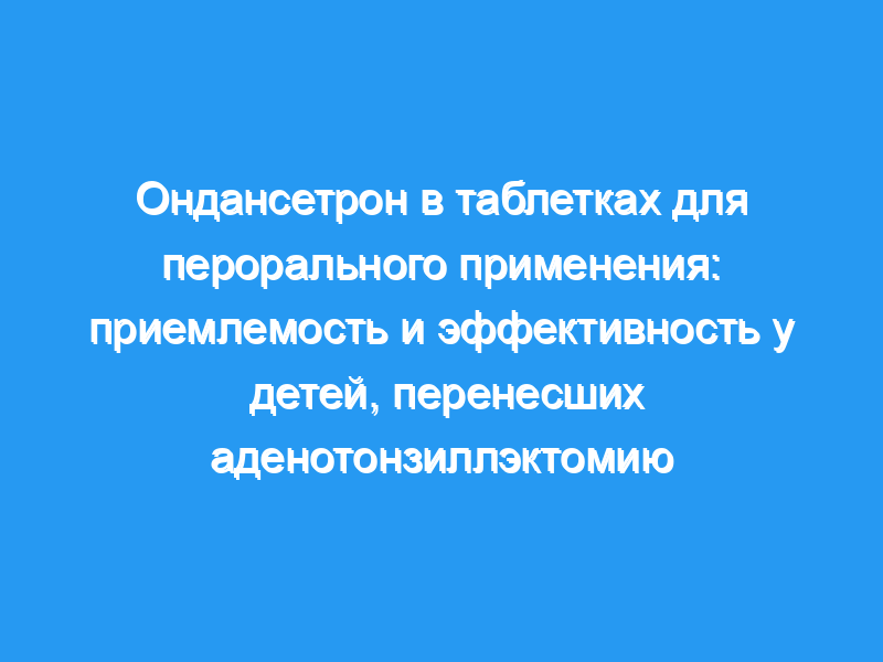 Поскольку эти способы не всегда доступны, мы изучили приемлемость и эффективность ондансетрона в таблетках для перорального применения (ODT). В этом двойном слепом рандомизированном плацебо-контролируемом исследовании 62 пациента, перенесших аденотонзиллэктомию, в возрасте от 5 до 11 лет, перед операцией получали ОДТ (4 мг) или плацебо.