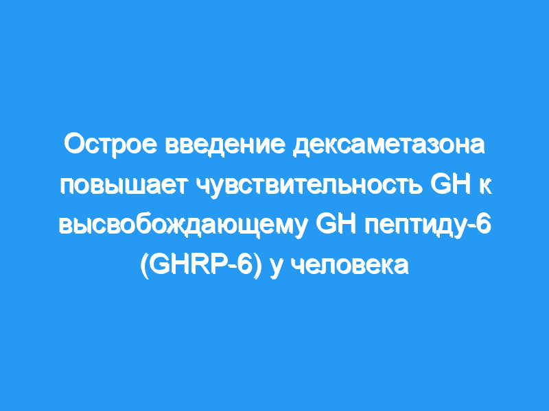 Острое введение глюкокортикоидов стимулирует секрецию гормона роста, вероятно, за счет снижения высвобождения соматостатина гипоталамусом. GHRP-6 представляет собой синтетический гексапептид, который увеличивает секрецию GH с помощью механизма действия, который еще не полностью известен, но, по-видимому, не путем ингибирования высвобождения гипоталамического соматостатина. Целью этого исследования было оценить влияние острого введения дексаметазона на чувствительность гормона роста к GHRP-6 у человека. Дизайн: Одна группа испытуемых получала внутривенно GHRP-6 (1 мкг/кг), GH-рилизинг-гормон (GHRH, 100 мкг), GHRH плюс GHRP-6 или физиологический раствор через 3,5 ч после перорального острого введения дексаметазона (4 мг, через 0600 ч). Вторую исследовательскую группу лечили GHRP-6, GHRH или GHRP-6 плюс GHRH после приема плацебо, следуя тому же протоколу. Пациенты: Шестнадцать нормальных субъектов (средний возраст: 29 +/- 3.3 лет), с нормальным ИМТ (22.4 +/- 2.0 кг/м2), были изучены. Восемь испытуемых получали дексаметазон, а остальные восемь получали плацебо.