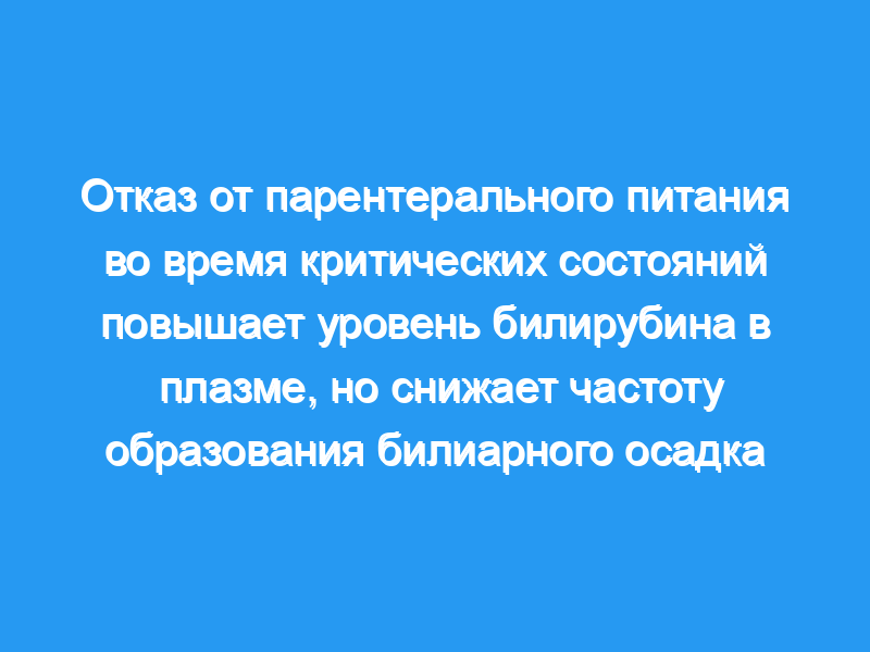 Холестатическая дисфункция печени (CLD) и билиарный осадок часто возникают во время критических состояний и, как утверждается, усугубляются парентеральным питанием (PN). Отсрочка начала ПН после 7-го дня в отделении интенсивной терапии (ОИТ) (поздняя ПН) ускорила выздоровление по сравнению с ранним началом ПН (ранняя ПН). Тем не менее, влияние стратегии питания на билиарный осадок и CLD не было полностью охарактеризовано. Это был заранее запланированный субанализ крупного рандомизированного контролируемого исследования раннего ПН по сравнению с поздним ПН (n = 4640). У всех пациентов определяли уровень билирубина в плазме крови (ежедневно) и ферменты печени (аланинаминотрансфераза [АЛТ], аспартатаминотрансфераза [АСТ], гамма-глутамилтранспептидаза [ГГТ], щелочная фосфатаза [АЛФ], дважды в неделю, n = 3216). В случайной заранее определенной подгруппе пациентов желчные кислоты (БАВ) в плазме крови также определялись количественно на исходном уровне и на 3, 5 и последний день отделения интенсивной терапии (n = 280). Билиарный осадок оценивали ультразвуковым методом на 5-й день отделения интенсивной терапии (n = 776). С 1-го дня после рандомизации и до конца 7-дневного интервенционного окна уровень билирубина был выше в группе с поздним ПН, чем в группе с ранним ПН (P <, 0,001). В группе с поздней ПН, как только ПН была начата на 8-й день, уровень билирубина снизился, и две группы стали сопоставимыми. Максимальные уровни ГГТ, АЛП и АЛТ были ниже в группе с поздним ПН (P <, 0,01). Конъюгированный с глицином/таурином первичный БАв увеличивался с течением времени в отделении интенсивной терапии (P <, 0,01), аналогично для двух групп. У меньшего числа пациентов с поздней ПН, чем в группе с ранней ПН, на 5-й день развился билиарный осадок (37% против 45%, Р = 0,04).