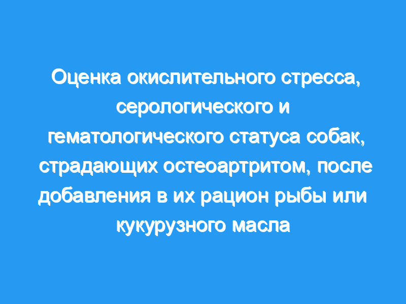 В этом проспективном рандомизированном, контролируемом, двойном слепом исследовании мы оценили гематологические и биохимические показатели у собак с ОА после приема концентрированного продукта из глубоководного рыбьего жира омега-3 или кукурузного масла. Образцы крови у 77 собак, принадлежащих клиентам, у которых был диагностирован ОА, были взяты до (исходный уровень) и через 16 недель после перорального приема 0,2 мл/кг массы тела /день глубоководного рыбьего жира или кукурузного масла. Оценивали циркулирующий малоновый диальдегид (MDA), глутатион (GSH), железо, не связанное с трансферрином (NTBI), свободный карнитин (Free-Car), 8-гидрокси-2-дезоксигуанозин (8-OH-dG) и жирные кислоты сыворотки, гемограммы и биохимию сыворотки. Различия внутри и между группами от исходного уровня до конца анализировали с использованием повторных проб T-теста или рангового теста Уилкоксона и независимых проб T-теста или теста Манна-Уитни.