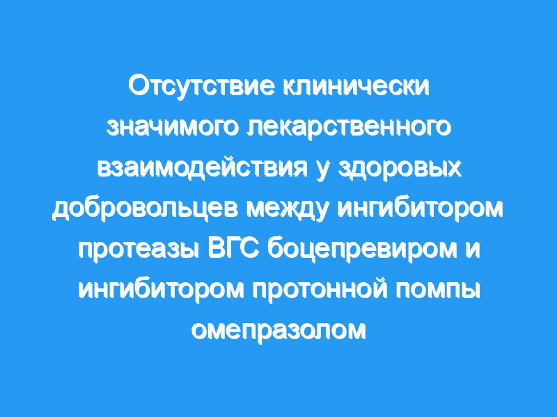 Все 24 субъекта (15 мужчин) завершили исследование, и никаких серьезных побочных эффектов зарегистрировано не было. Среднее геометрическое отношение (90% ДИ) площади под кривой зависимости концентрации в плазме крови от времени до 8 ч (AUC0-8) и максимальной концентрации в плазме крови (Cmax) боцепревира с омепразолом по сравнению с боцепревиром в одиночку составило 0,92 (0,87-0,97) и 0,94 (0,86-1,02) соответственно. Для омепразола эти значения составили 1,06 (0,90-1,25) для AUC0-8 и 1,03 (0,85-1,26) для Cmax для комбинации по сравнению с одним омепразолом.