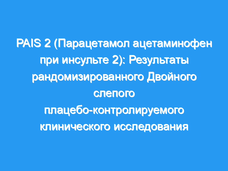 PAIS 2 (Парацетамол [ацетаминофен] при инсульте 2) было многоцентровым рандомизированным двойным слепым плацебо-контролируемым клиническим исследованием. Мы стремились охватить 1500 пациентов с острым ишемическим инсультом или внутримозговым кровоизлиянием в течение 12 часов после появления симптомов. Пациенты получали парацетамол в суточной дозе 6 г или соответствующее плацебо в течение 3 дней подряд. Первичным исходом был функциональный исход через 3 месяца, оцененный с помощью модифицированной шкалы Рэнкина и проанализированный с помощью многомерной порядковой логистической регрессии. Из-за медленного набора персонала и отсутствия финансирования исследование было преждевременно прекращено.
