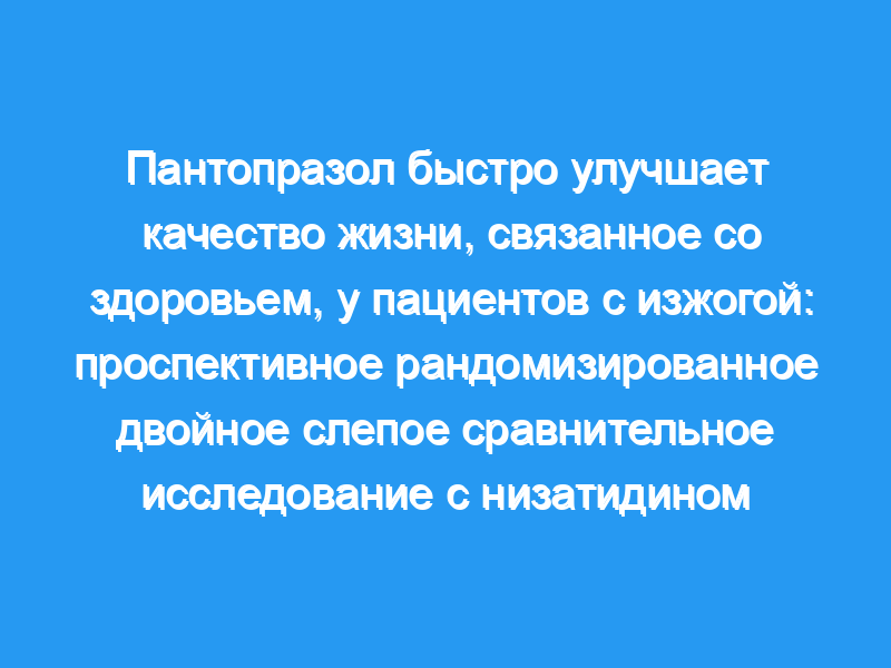 HRQoL улучшается быстрее и в большей степени после лечения пантопразолом, чем низатидином. Контроль изжоги достоверно предсказывает улучшение HRQoL во время острого лечения ГЭРБ. Наши данные подтверждают подход к использованию пантопразола вместо низатидина в качестве начальной терапии для пациентов с изжогой в условиях первичной медико-санитарной помощи.