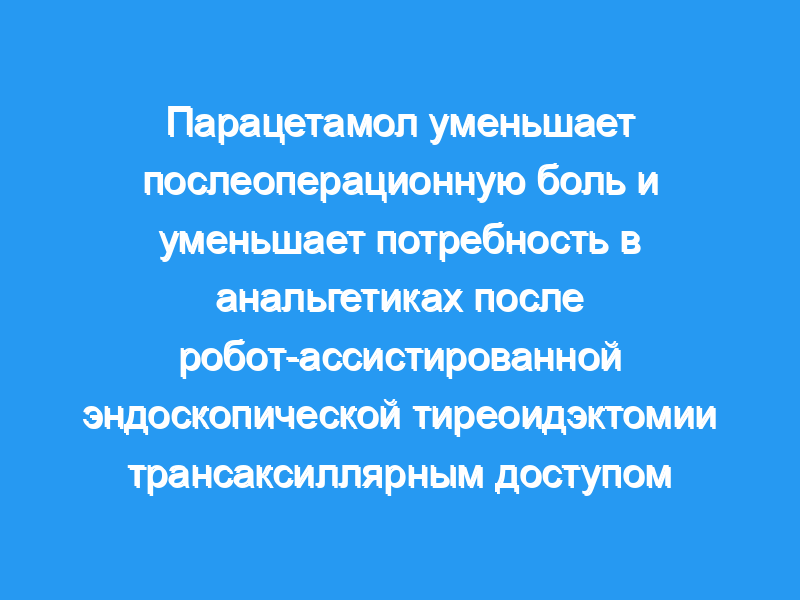 Мы пришли к выводу, что повторное введение 1 г парацетамола внутривенно в течение 24 ч является простым, эффективным, безопасным и хорошо переносимым для обезболивания у пациентов с умеренной или тяжелой послеоперационной болью после безгазовой робот-ассистированной эндоскопической тиреоидэктомии, выполненной трансаксиллярным доступом.