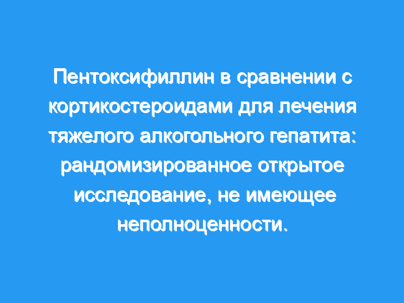 1-месячная выживаемость пациентов, получавших пентоксифиллин, составила 75,8% (15 смертей) по сравнению с 88,1% (7 смертей) у пациентов, принимавших преднизолон, при разнице в лечении 12,3% (95% доверительный интервал, от -4,2% до 28,7%, р = 0,08). 95% доверительный интервал для наблюдаемой разницы превышал заданный предел неполноценности (Δ15%) и включал ноль. 6-месячная выживаемость достоверно не отличалась между группами пентоксифиллина и преднизолона (64,5% против 72,9%, р = 0,23). Через 7 дней ответ на терапию, оцененный по модели Лилля, был значительно ниже в группе преднизолона (n = 58), чем в группе пентоксифиллина (n = 59): 0,35 против 0,50 (р = 0,012). Осложнения гепатита, включая гепаторенальный синдром и побочные эффекты, такие как инфекция и желудочно-кишечное кровотечение, были одинаковыми в двух группах.