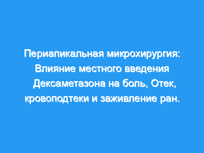 Это исследование показывает, что доза дексаметазона в дозе 4 мг, вводимая через местную подслизистую инъекцию после периапикальной микрохирургии, оказывает минимальное влияние на боль, кровоподтеки и видимое заживление ран в любое время в течение 7-дневного интервала, и влияние на отек кажется ограниченным.