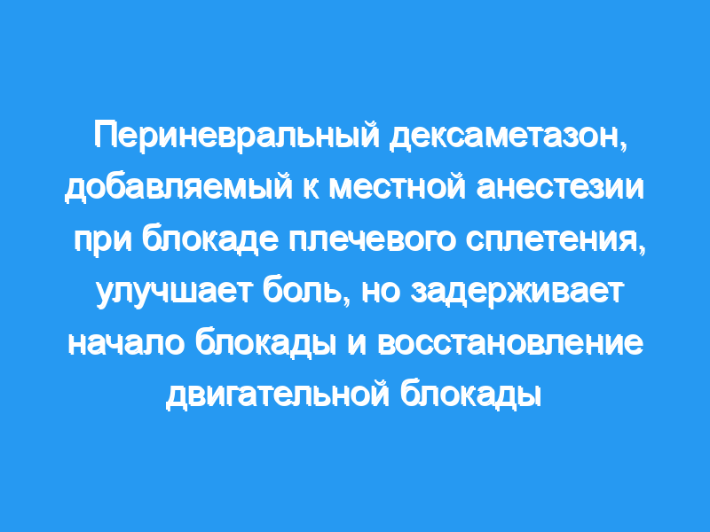 Добавление периневрального дексаметазона к растворам местных анестетиков значительно улучшило послеоперационную боль при блокаде плечевого сплетения без увеличения осложнений. Однако периневральный адъювант дексаметазон замедлял наступление сенсорной и моторной блокады и увеличивал продолжительность моторной блокады. Меньшие дозы дексаметазона (4-5 мг) были столь же эффективны, как и более высокие дозы (8-10 мг).