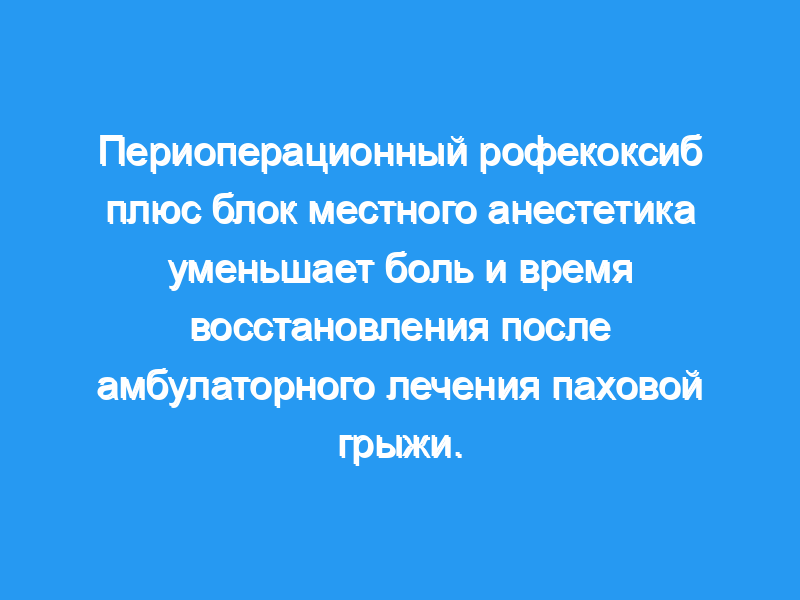 В этом исследовании мы сравнили показатели боли после паховой герниорафии у пациентов, получавших предоперационную блокаду поля местным анестетиком (PL) или PL в сочетании с периоперационным рофекоксибом, с контрольной группой, получавшей стандартную car.