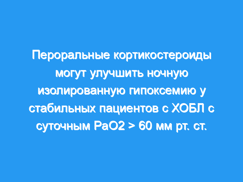 Целью этого исследования было оценить, может ли короткий цикл терапии пероральным метилпреднизолоном в сочетании с традиционной терапией улучшить изолированную ночную гипоксемию, подтвержденную пульсоксиметрией у 28 пациентов (19 М/9 F, средний возраст 71 +/- 8.31 ) со стабильной ХОБЛ средней и тяжелой степени (средняя ОФВ1 от 43.33 +/- 9.38 теоретического) и дневной PaO2 >, 60 мм рт.ст.