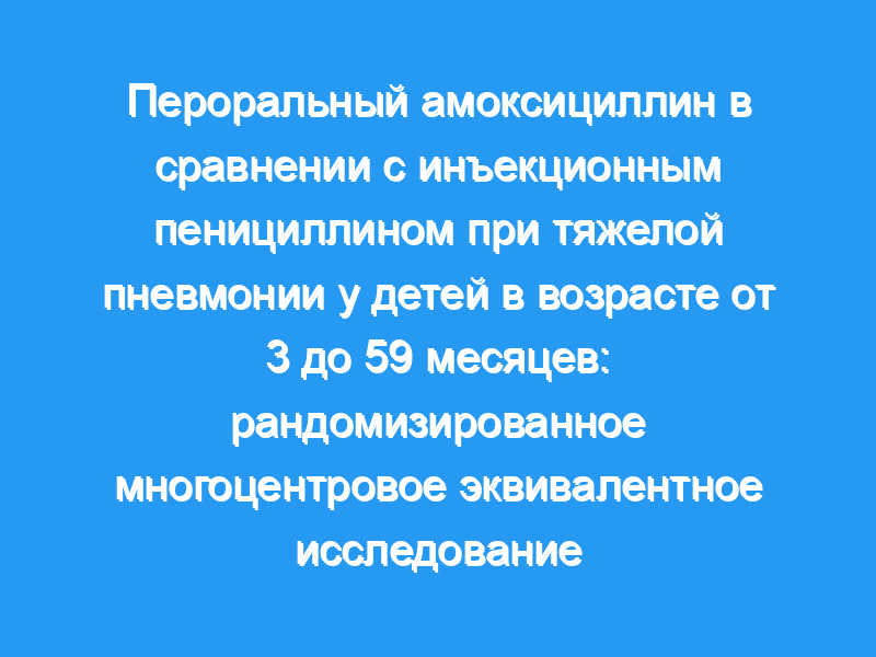 Это многоцентровое рандомизированное открытое исследование эквивалентности было проведено в центрах третичной медицинской помощи в восьми развивающихся странах Африки, Азии и Южной Америки. Дети в возрасте 3-59 месяцев с тяжелой пневмонией были госпитализированы на 48 часов и, если симптомы улучшились, были выписаны с 5-дневным курсом перорального приема амоксициллина. 1702 ребенка были случайным образом распределены для приема либо перорального амоксициллина (n=857), либо парентерального пенициллина (n=845) в течение 48 часов. Последующие оценки были проведены через 5 и 14 дней после зачисления. Первичным исходом была неудача лечения (сохранение втягивания нижней части грудной клетки или новые признаки опасности) через 48 часов. Анализы проводились в соответствии с намерением к лечению и в соответствии с протоколом. Результаты: Безуспешность лечения составила 19% в каждой группе (161 пациент, пенциллин, 167 амоксиллин, разница в риске -0,4%, 95% ДИ -4,2-3,3) через 48 часов. Младенчество (возраст 3-11 месяцев, отношение шансов 2,72, 95% ДИ 1,95-3,79), очень учащенное дыхание (1,94, 1,42-2,65) и гипоксия (1,95, 1,34-2,82) на исходном уровне предсказывали неудачу лечения с помощью многофакторного анализа. Интерпретация: Инъекционный пенициллин и пероральный амоксициллин эквивалентны для лечения тяжелой пневмонии в контролируемых условиях. Потенциальные преимущества перорального лечения включают снижение (1) риска инфекций, передаваемых через иглы, (2) необходимости направления или госпитализации, (3) административных расходов и (4) расходов для семьи.
