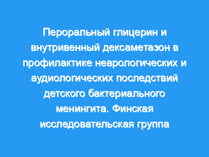 Чтобы оценить ценность дополнительного внутривенного введения дексаметазона (DXM) и перорального глицерина (GLY) для лечения бактериологически подтвержденного бактериального менингита, 122 младенцев и детей с бактериальным менингитом были рандомизированы для получения DXM внутривенно (n = 32), GLY перорально (n = 30), DXM плюс GLY (n = 34) или ни один (n = 26) из этих препаратов.