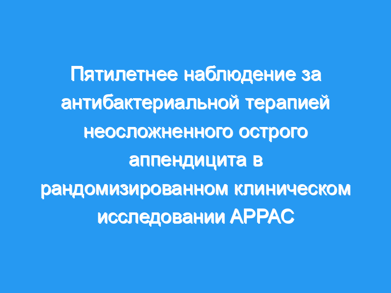 Определить частоту поздних рецидивов аппендицита после антибактериальной терапии для лечения неосложненного острого аппендицита. Дизайн, условия и участники: Пятилетнее наблюдательное наблюдение за пациентами в многоцентровом рандомизированном клиническом исследовании Appendicitis Acuta (APPAC), сравнивающем аппендэктомию с антибактериальной терапией, в котором 530 пациентов в возрасте от 18 до 60 лет с неосложненным острым аппендицитом, подтвержденным компьютерной томографией, были рандомизированы для проведения аппендэктомии (n = 273) или получать антибактериальную терапию (n = 257). Первоначальное исследование проводилось с ноября 2009 года по июнь 2012 года в Финляндии, последнее последующее наблюдение было проведено 6 сентября 2017 года. Этот текущий анализ был сосредоточен на оценке 5-летних результатов для группы пациентов, получавших только антибиотики. Вмешательства: Открытая аппендэктомия против антибиотикотерапии с внутривенным введением эртапенема в течение 3 дней с последующим 7-дневным пероральным приемом левофлоксацина и метронидазола. Основные результаты и меры: В этом анализе предварительно определенные вторичные конечные точки, о которых сообщалось при 5-летнем наблюдении, включали поздний (после 1 года) рецидив аппендицита после лечения антибиотиками, осложнения, продолжительность пребывания в больнице и отпуск по болезни.