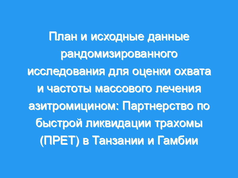 Партнерство по быстрой ликвидации трахомы контролирует 2 рандомизированных клинических испытания на уровне сообщества в Танзании и Гамбии. Хотя каждое исследование является самостоятельным мероприятием, протоколы, методы сбора данных и аналитические подходы были согласованы, чтобы можно было делать обобщения. Сообщества в каждом месте были рандомизированы с использованием факторной схемы 2X2 для стандартного (80%-90,0%) против высокого (более 90,0%) охвата лечением, сообщества были дополнительно рандомизированы для ежегодного лечения в течение 3 лет по сравнению с правилом «градации», когда данные указывают на отсутствие фолликулярной трахомы или инфекции, и ежегодное лечение прекращается..