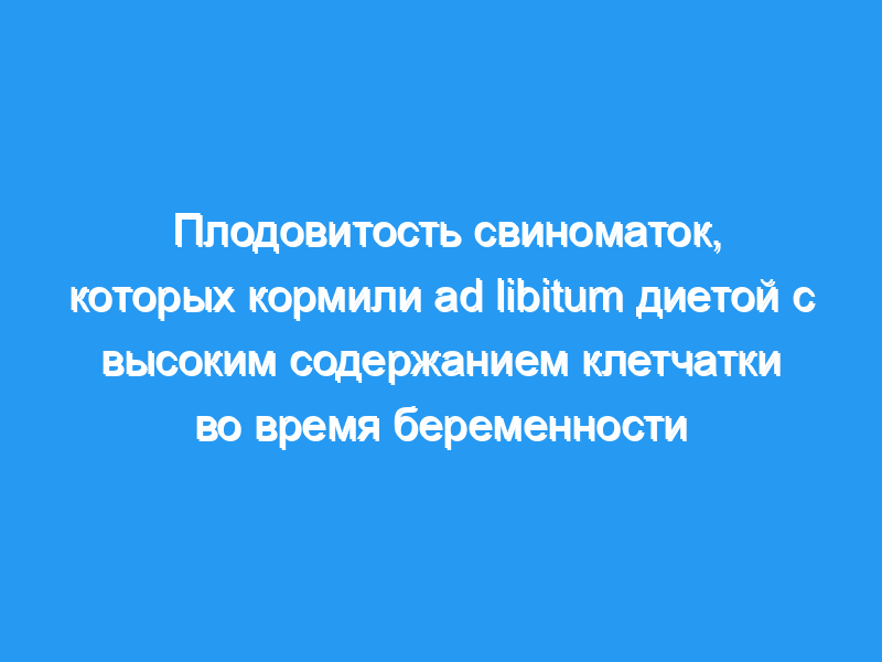 Содержание энергии в корме составляло 9,3 МДж/кг NE). Стратегия кормления (ADLIB против CONT) не повлияла на частоту беременности (85,8 против 90,9, p >, 0,05), интервал отъема до течки (7,7 против 7,3 дней, p >, 0,05), поросят, родившихся живыми (11,5 ± 3,5 против 11,6 ± 3,3, p >, 0,05), мертворожденных поросят (1,2 ± 1,8 против 0,9 ± 1,5, p >, 0,05), ни на концентрацию прогестерона (p >, 0,05). Свиноматки CONT отняли от груди больше поросят (9,7 ± 2,2 против 9,4 ± 2,0, p <, 0,01), тогда как поросята от свиноматок AD LIB были тяжелее при отъеме (8,8 ± 0,9 против 8,0 ± 1,3 кг, p <, 0,05). В заключение следует отметить, что неограниченное питание с высоким содержанием клетчатки во время беременности не повлияло на репродуктивную функцию.