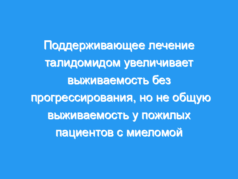Поддерживающая терапия талидомидом после трансплантации стволовых клеток привела к увеличению выживаемости без прогрессирования и общей выживаемости в нескольких исследованиях, но его роль у пациентов с множественной миеломой, не имеющих права на трансплантацию, остается неясной. В этом исследовании оценивалось влияние талидомид-интерферона по сравнению с поддерживающей терапией интерфероном у пожилых пациентов с множественной миеломой. Дизайн и методы: Из 289 пожилых пациентов с множественной миеломой, которые были рандомизированы на индукционную терапию талидомидом-дексаметазоном или мелфаланом-преднизолоном, 137 в конечном итоге завершили 9 циклов индукционной терапии со стабильным заболеванием или лучше и, таким образом, получили право на поддерживающее лечение. Из них 128 были рандомизированы либо на талидомид-интерферон, либо только на интерферон. Первичными конечными точками исследования были выживаемость без прогрессирования и показатели ответа, вторичными конечными точками были общая выживаемость, токсичность и качество жизни.
