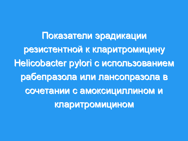 Сравнить показатели эрадикации тройной терапии с использованием амоксициллина (A), кларитромицина (C) и рабепразола (R) или лансопразола (L) против чувствительных к кларитромицину и устойчивых к кларитромицину штаммов. Двести девяносто пять пациентов были случайным образом разделены на четыре группы и лечились в течение 1 недели: 147 пациентов лечились RAC, т.е. 49 случаев — R20C400 (10 мг R + 750 мг A + 200 мг C, два раза в день), 48 случаев — R40C400 (20 мг R + 750 мг A + 200 мг C, два раза в день) и 50 случаев с R40C800 (20 мг R + 750 мг A + 400 мг C, два раза в день), 148 случаев с лечением LAC (30 мг L + 750 мг A + 200 мг C, два раза в день).