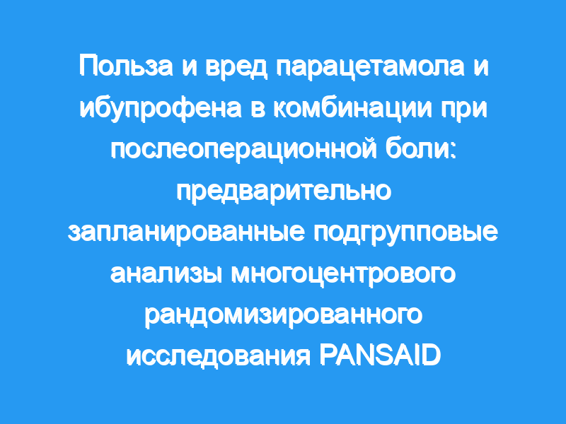 Исследование «Парацетамол и ибупрофен в комбинации» (PANSAID) показало, что сочетание парацетамола и ибупрофена приводит к более низкому потреблению опиоидов, чем каждый препарат в отдельности, и мы не обнаружили увеличения риска вреда при использовании ибупрофена по сравнению с парацетамолом. Целью этого подгруппового анализа было изучение различий в пользе и вреде вмешательств в разных подгруппах. Мы предположили, что результаты вмешательства будут отличаться в подгруппах с разным риском возникновения боли или нежелательных явлений.