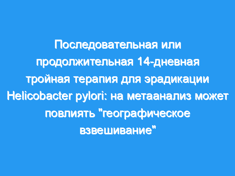Провести мета-анализ, сравнивающий последовательную и продолжительную 14-дневную тройную терапию с учетом «географического взвешивания», рассмотрев анализ подгрупп в соответствии с областями низкой и высокой резистентности к метронидазолу/кларитромицину.