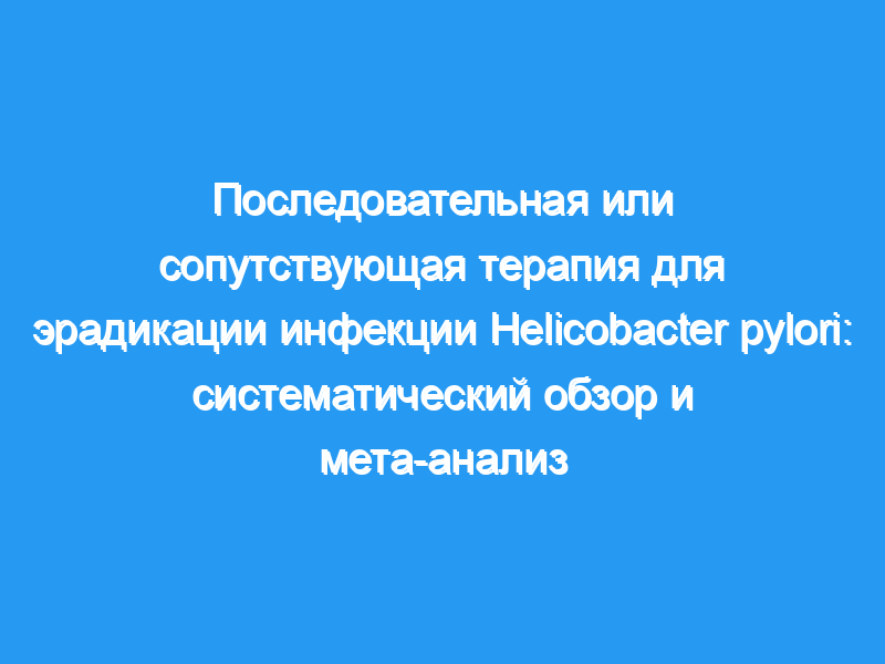 Предпосылки и цель: Эрадикация инфекции Helicobacter pylori (H. pylori) с помощью тройной терапии (ТТ) снизилась во многих странах, что побудило искать альтернативные схемы лечения. Последовательная терапия (ST) и сопутствующая терапия (CT) были предложены в качестве схем первой линии в областях с высокой резистентностью к кларитромицину. Мы провели мета-анализ, чтобы сравнить показатели эрадикации CT и ST для H. pylori.