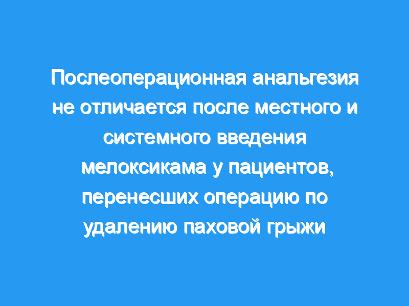 Мы не выявили различий в показателях боли и потреблении анальгетика между местным и внутривенным введением мелоксикама в дозе 7,5 мг. в течение первых 24 ч после герниорафии, в то время как концентрация мелоксикама в плазме крови была ниже после местного введения. Эти результаты указывают на отсутствие различий в облегчении боли после концентрации мелоксикама в грыжевой ране или после быстрого достижения высоких уровней в крови (внутривенно). Местное введение мелоксикама может дать преимущество перед системным введением, вызывая меньшую частоту системных побочных эффектов.