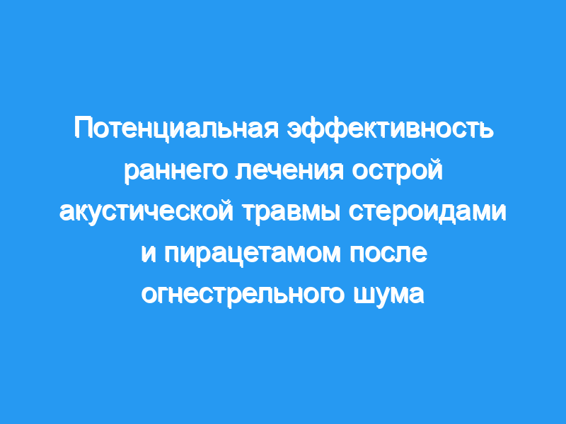 Целью этого рандомизированного исследования была оценка раннего эффекта лечения острой акустической травмы (AAT) стероидами и пирацетамом в выборке из 52 молодых солдат, которые подвергались воздействию интенсивного шума стрельбы (винтовка G3). Эти пациенты были разделены на три группы: (1) группа А (20 пациентов), в которой лечение началось в течение первого часа после ААТ, (2) группа В (17 пациентов), в которой лечение началось более чем на 1 ч позже и менее чем через 16 ч после ААТ и (3) группа C (15 пациентов), в которой лечение началось через 24 ч или более.
