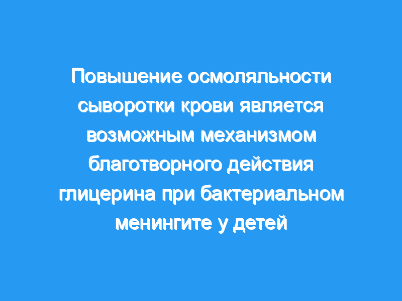 Тридцать шесть детей в возрасте от 2 месяцев до 12 лет с менингитом получали лечение цефтриаксоном и были рандомизированы принимать также либо дексаметазон внутривенно, либо глицерин перорально, либо оба средства, либо ни то, ни другое. Заболевание контролировалось по заранее установленным критериям. Основными показателями результата были изменения осмоляльности плазмы и диуреза. Девять детей получали глицерин, 8 дексаметазон, 11 оба средства и 8 только плацебо. Основными выявленными возбудителями были Streptococcus pneumoniae, Haemophilus influenzae типа в и золотистый стафилококк. Только у пациентов, получавших глицерин, осмоляльность плазмы повышалась до 3% по сравнению со средним исходным значением 294 мОсм/кг в группе глицерина и 295 мОсм/кг в группе глицерина и дексаметазона. Это изменение произошло в течение 6 часов, критического периода лечения, и продолжалось < 24 часа. Кровяное давление не пострадало, и диурез не увеличился. У пациентов, получавших только дексаметазон и только плацебо, наблюдалось немедленное снижение осмоляльности сыворотки крови.