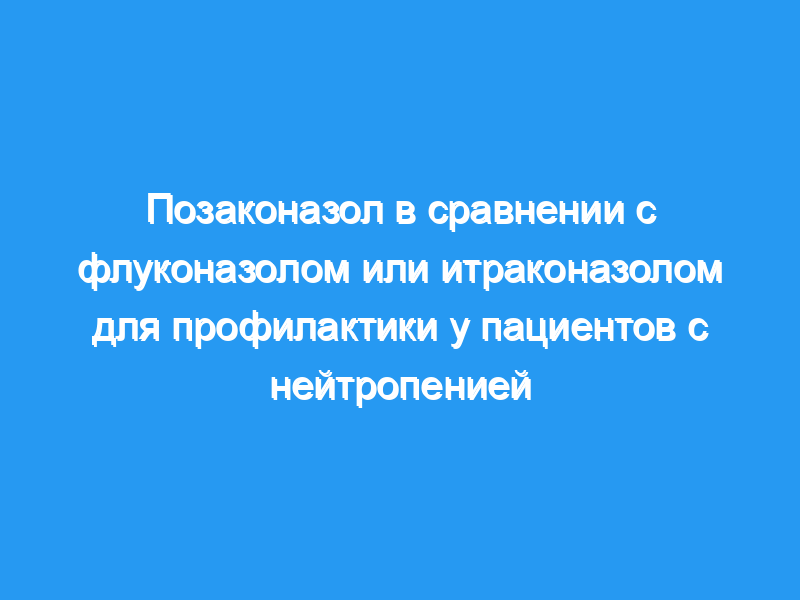 В этом рандомизированном многоцентровом исследовании с участием оценщиков, которые не знали о назначении лечения, мы сравнили эффективность и безопасность позаконазола с эффективностью и безопасностью флуконазола или итраконазола в качестве профилактики у пациентов с длительной нейтропенией. Пациенты получали профилактику с каждым циклом химиотерапии до выздоровления от нейтропении и полной ремиссии, до появления инвазивной грибковой инфекции или на срок до 12 недель, в зависимости от того, что наступило раньше. Мы сравнили частоту подтвержденных или вероятных инвазивных грибковых инфекций во время лечения (первичная конечная точка) между группами позаконазола и флуконазола или итраконазола, смерть от любой причины и время до смерти были вторичными конечными точками. В общей сложности 304 пациента были рандомизированы для получения позаконазола, а 298 пациентов были рандомизированы для получения флуконазола (240) или итраконазола (58). Доказанные или вероятные инвазивные грибковые инфекции были зарегистрированы у 7 пациентов (2%) в группе позаконазола и у 25 пациентов (8%) в группе флуконазола или итраконазола (абсолютное снижение в группе позаконазола, -6%, 95% доверительный интервал, от -9,7 до -2,5%, P<,0,001), выполнение статистических критериев превосходства. Значительно меньше пациентов в группе позаконазола имели инвазивный аспергиллез (2 [1%] против 20 [7%], P<,0,001). Выживаемость была значительно выше среди реципиентов позаконазола, чем среди реципиентов флуконазола или итраконазола (Р=0,04). О серьезных нежелательных явлениях, возможно или вероятно связанных с лечением, сообщили 19 пациентов (6%) в группе позаконазола и 6 пациентов (2%) в группе флуконазола или итраконазола (Р=0,01). Наиболее частыми нежелательными явлениями, связанными с лечением, в обеих группах были нарушения со стороны желудочно-кишечного тракта.