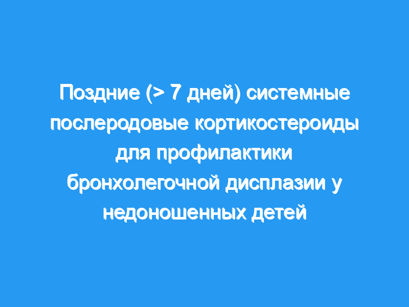 Изучить относительные преимущества и побочные эффекты поздней системной послеродовой терапии кортикостероидами (>, 7 дней) для недоношенных детей с развивающейся или установленной бронхолегочной дисплазией. Методы поиска: Для обновления за 2017 год мы использовали стандартную стратегию поиска Cochrane Neonatal для поиска в Центральном реестре контролируемых исследований Cochrane (CENTRAL, 2017, Выпуск 1), MEDLINE через PubMed (с января 2013 года по 21 февраля 2017 года), Embase (с января 2013 года по 21 февраля 2017 года) и Совокупном Указатель литературы по сестринскому делу и смежной медицинской литературе (CINAHL, с января 2013 года по 21 февраля 2017 года). Мы также провели поиск по базам данных клинических испытаний, материалам конференций и ссылочным спискам извлеченных статей для рандомизированных контролируемых исследований и квазирандомизированных исследований. Критерии отбора: Мы отобрали для включения в этот обзор рандомизированные контролируемые исследования (РКИ), сравнивающие системное послеродовое лечение кортикостероидами с плацебо или без него, начатое более чем через семь дней после рождения у недоношенных детей с развивающейся или установленной бронхолегочной дисплазией. Сбор и анализ данных: Мы использовали подход GRADE для оценки качества доказательств.Мы собрали и проанализировали данные о клинических исходах, включая смертность, бронхолегочную дисплазию, смерть или бронхолегочную дисплазию, невозможность экстубации, осложнения во время первичной госпитализации и отдаленные последствия для здоровья.