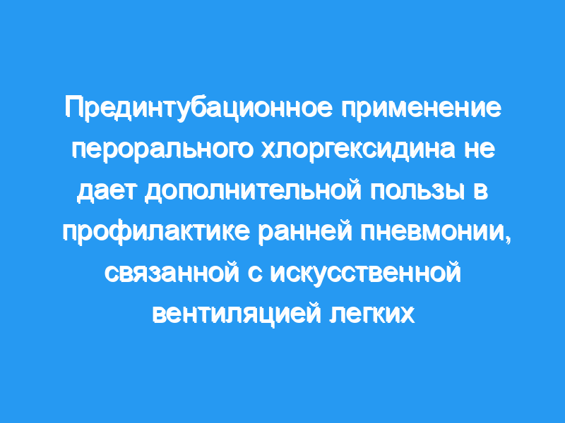 Ежедневное применение перорального хлоргексидина глюконата (CHX) после интубации для снижения риска пневмонии, связанной с искусственной вентиляцией легких (VAP), в настоящее время является стандартом лечения во многих отделениях интенсивной терапии. В этом рандомизированном клиническом исследовании оценивалась польза добавления прединтубационной дозы CHX к известной пользе постинтубационной CHX для снижения риска раннего возникновения VAP. Вторичной целью было проверить влияние перорального применения CHX перед интубацией на раннюю колонизацию эндотрахеальной трубки (ETT).