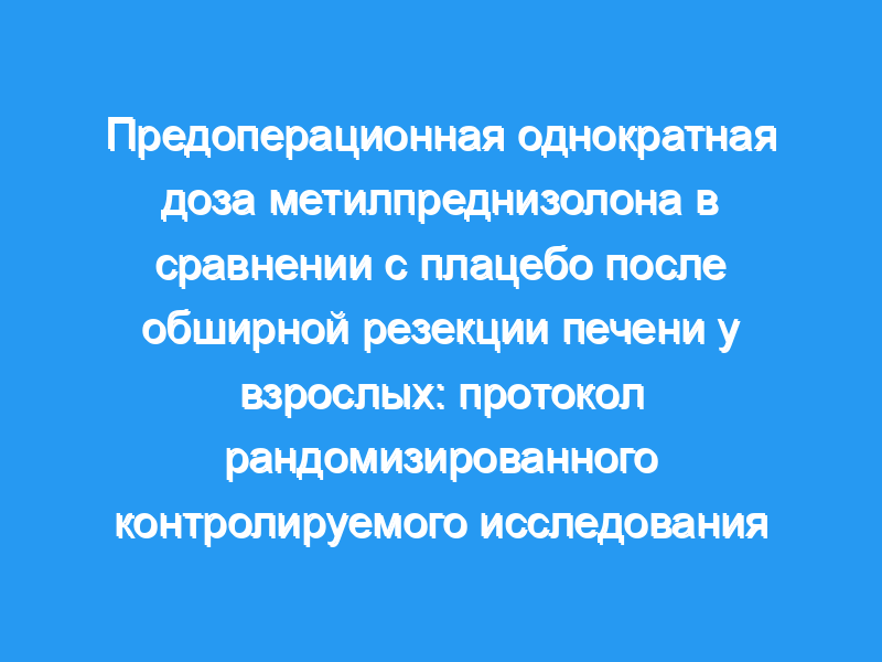 Хотя рандомизированные контролируемые исследования показали, что предоперационные глюкокортикоиды могут улучшить послеоперационные суррогатные исходы у пациентов, перенесших обширную резекцию печени, отсутствуют доказательства, подтверждающие улучшение важных для пациента исходов. Цель этого исследования — оценить влияние болюсного введения глюкокортикоида метилпреднизолона по сравнению с плацебо во время индукции анестезии на послеоперационную заболеваемость среди взрослых, перенесших плановую большую резекцию печени. Методы и анализ: Это будет рандомизированное, двойное, параллельное групповое, первичное исследование. В исследование будут включены все последовательные взрослые, обратившиеся в крупную канадскую больницу третичного звена, которые согласились на проведение обширной резекции печени. Пациенты в возрасте старше 18 лет и те, кто в настоящее время получает системную терапию кортикостероидами, будут исключены. Мы случайным образом распределим участников на предоперационное внутривенное болюсное введение метилпреднизолона в дозе 500 мг по сравнению с плацебо. Члены хирургической бригады и эксперты по оценке результатов будут слепы к статусу распределения лечения. Основным показателем результата будут послеоперационные осложнения. Вторичные показатели исхода будут включать смертность, частоту нескольких специфических послеоперационных осложнений и уровни в крови отдельных провоспалительных цитокинов, белков острой фазы и лабораторных ферментов печени или функциональных тестов на 0, 1, 2 и 5-й дни после операции. Частота послеоперационных осложнений и смертность будут сравниваться с использованием точного критерия Фишера, в то время как вышеуказанные лабораторные показатели будут сравниваться с использованием моделей со смешанными эффектами с случайным пересечением для конкретного субъекта. Этика и распространение: В этом исследовании будет оценено защитное действие однократной предоперационной дозы метилпреднизолона на риск послеоперационных осложнений. Отчет с результатами исследования будет представлен для публикации в соответствующем журнале примерно через 3 месяца после завершения сбора данных. Регистрационный номер испытания: NCT01997658, Предварительные результаты.